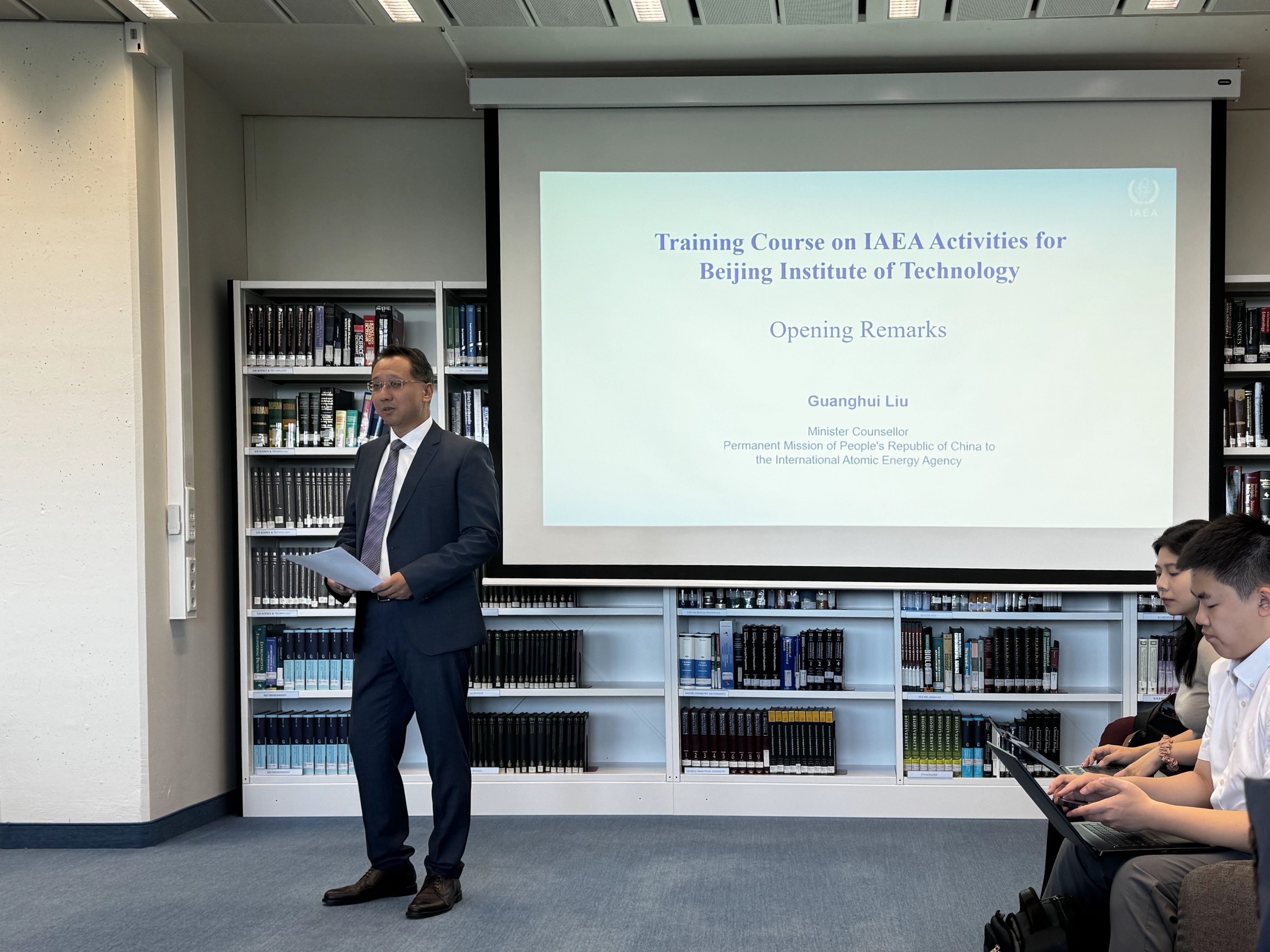 刘光辉公参对师生们的到来表示欢迎,并介绍了中国加入机构40年来履行国际义务、开展务实合作和取得的成绩,强调了机构平台在国际核领域合作的中心地位,以及核安全、安保和保障在当今国际环境中的重要性,希望同学们积极参与研讨、学有所获,勇担国家和国际社会重任。黄玮司长对中国代表团、秘书处各位同事的组织支持表示感谢,对北理工师生团队表示欢迎,希望一天的课程能够让同学们对国际原子能机构、世界核能和平利用、核能支持可持续发展目标,以及防止核不扩散有全面的认识了解,期待同学们为核能和平发展和治理做出贡献。刘浩教授谈到,国际原子能机构在全球核安全、安保和核不扩散方面采取了多项措施,是该领域最重要的国际组织,他指出在全球推进清洁能源、促进绿色和可持续发展进程中,核能具有特殊的重要性和地位,因此要求具有确保核能和平发展利用的治理体系,中国在核能和平利用方面发挥了重要作用,期待各位同学通过国际原子能机构全面了解核能和平利用和不扩散国际体系,做好服务成员国、国际社会的充分准备。